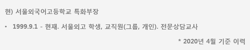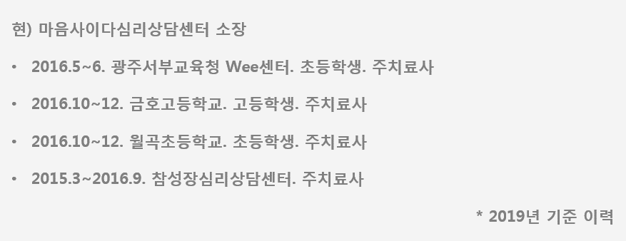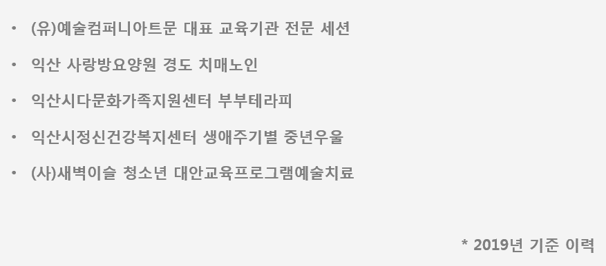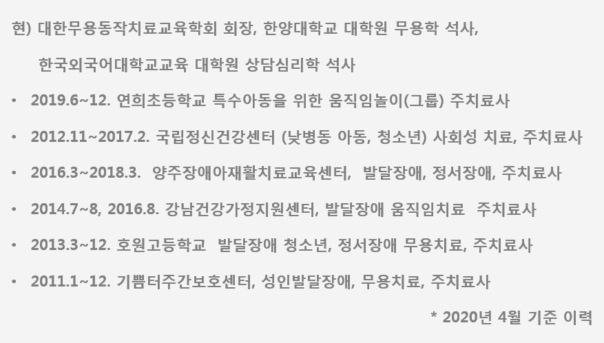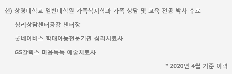 현) 씨앗예술심리치료 연구소 소장. 순천향대학교 교육과학과 예술심리치료 박사 수료 2020-현재 극동대학교 상담심리치료학과 출강 2009-현재 한국문화예술진흥원 장애아동 예술강사 2021-현재 발달지연 아동 청소년 개인치료 *2022년 4월 기준 이력 |
