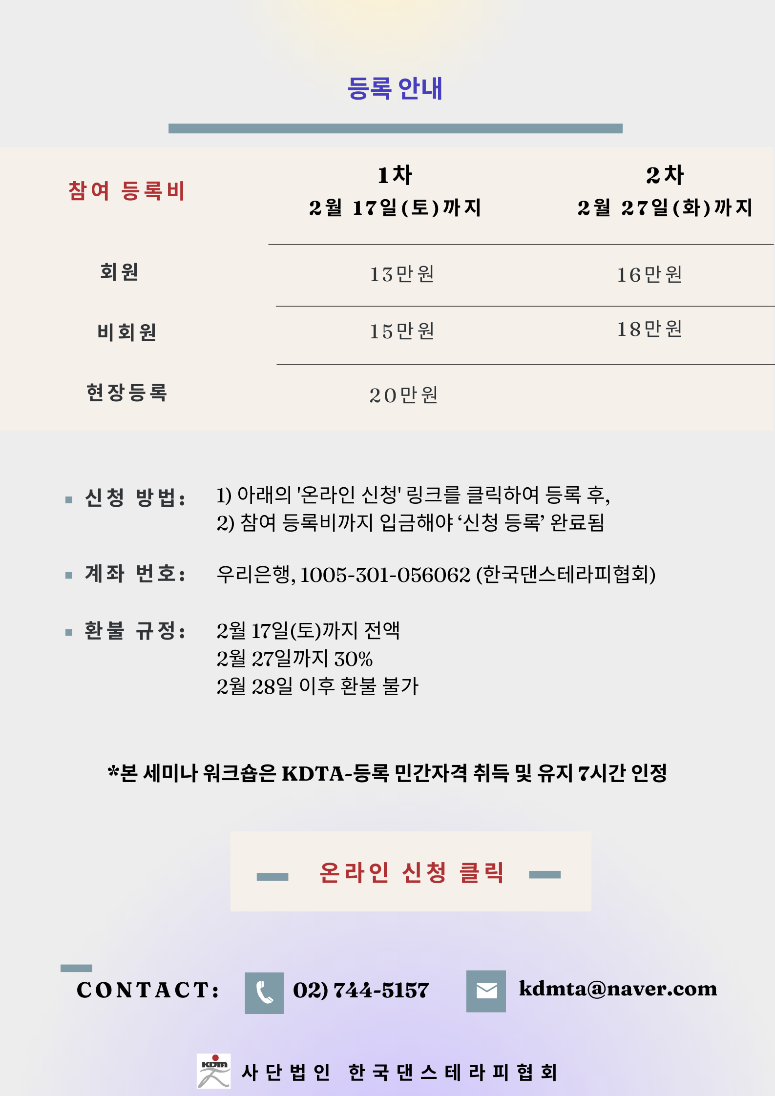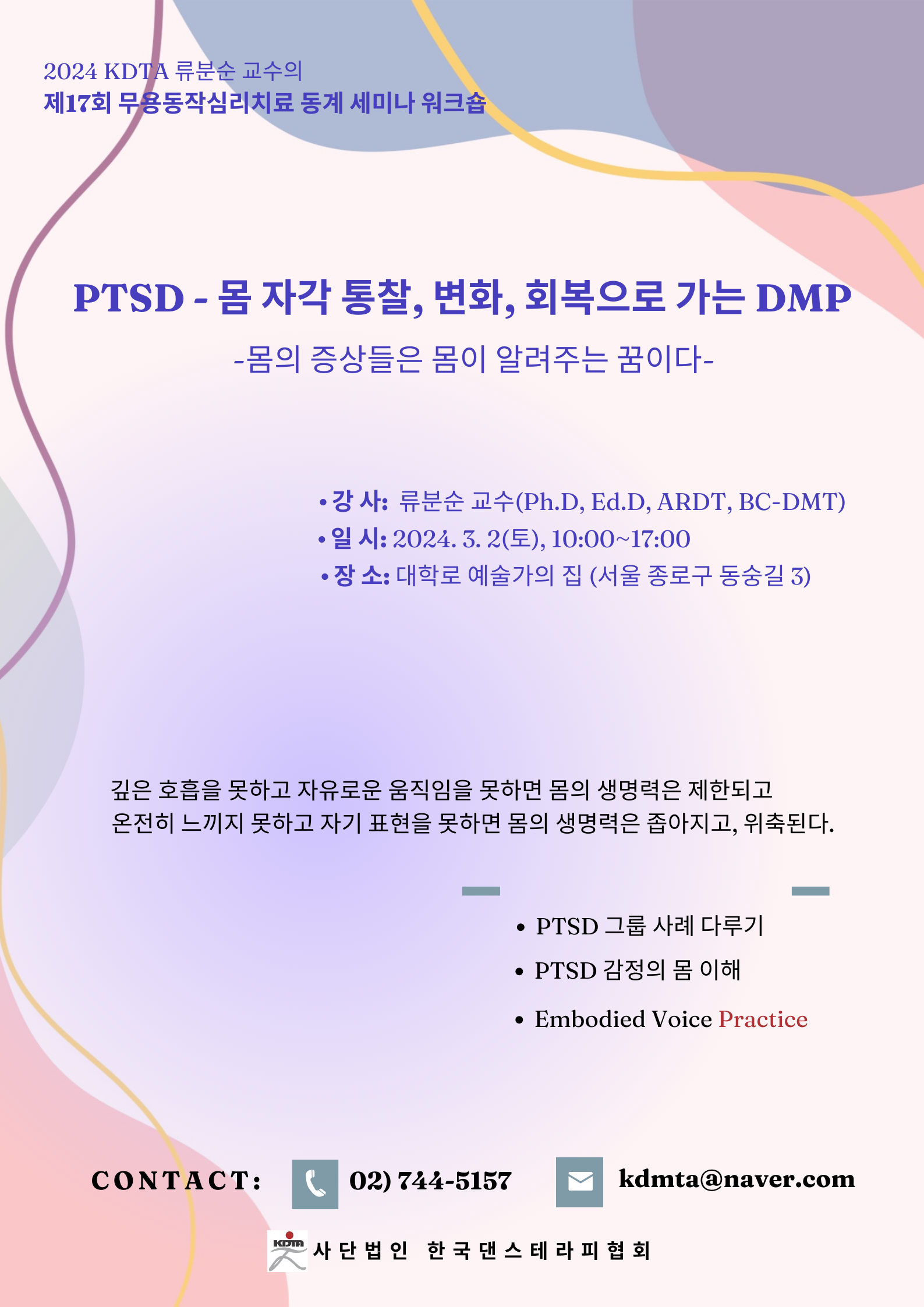[워크숍] 2024' 제17회 동계무용동작치료워크숍 'PTSD-몸자각 통찰, 변화, 회복으로 가는 DMP'