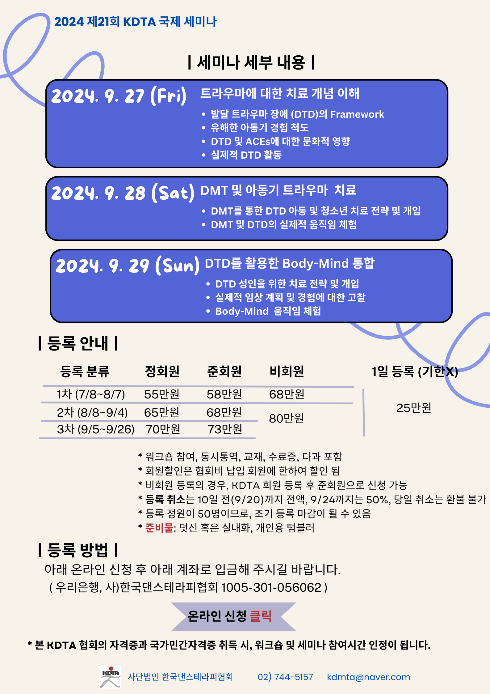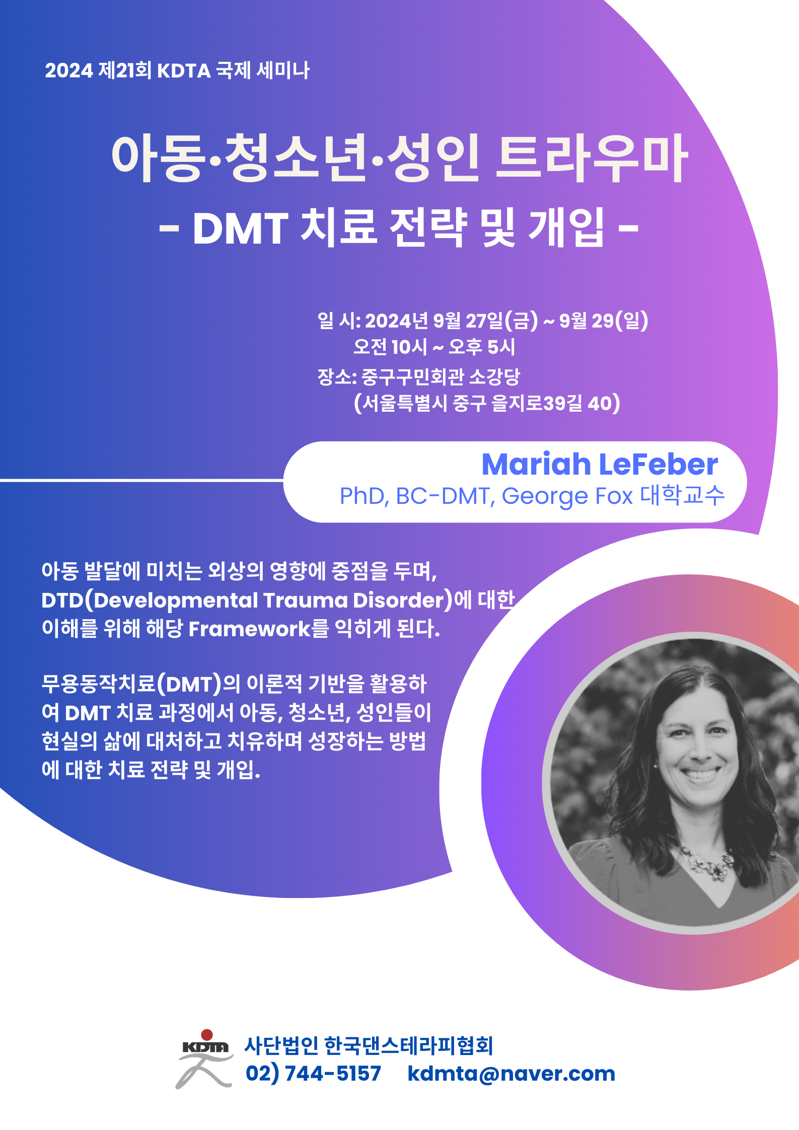 [워크숍] 2024 제21회 KDTA 국제세미나 '아동.청소년.성인 트라우마: DMT 치료 전략 및 개입