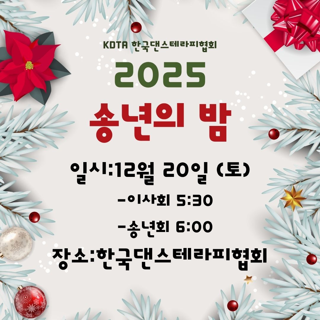 장소: 서울 종로 창경궁로 269, 4층 (사단법인 한국댄스테라피협회) 회비: 2만원(현장 납부)