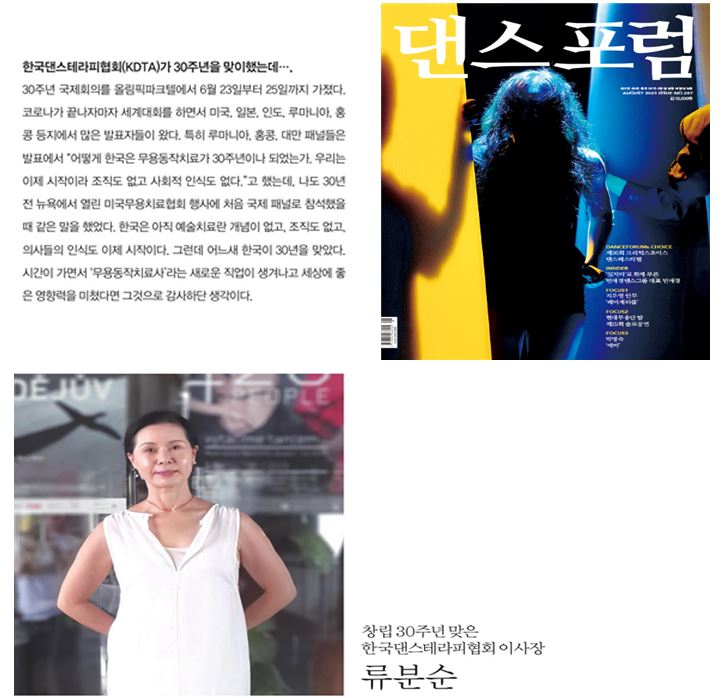 류분순 교수께서는 KDTA 창립 30주년을 맞아 월간 무용전문지 '댄스포럼'에서 인터뷰를 진행하셨습니다. 이 인터뷰에서는 창립 기념 축하와 무용동작치료에 대한 내용이 소개되었습니다. 해당 내용은 2023년 8월호 (Vol.287) 댄스포럼에 주요 기사로 실렸으니, 아래 링크에서 확인해 주시길 바랍니다.